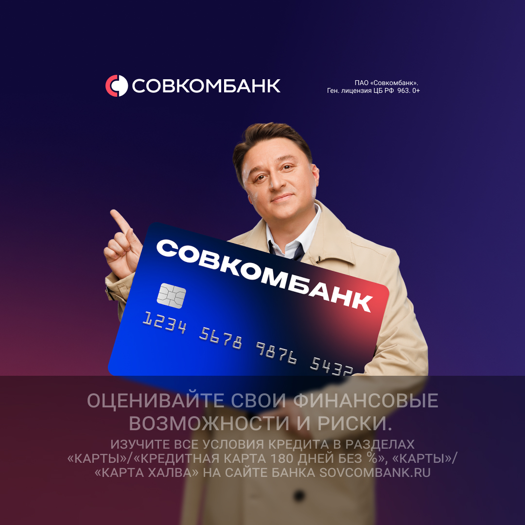 *Акция "300 дней без процентов". Сроки проведения: с 30.12.2025 по 07.03.2026. Для участников Акции, впервые оформивших кредитную карту, участвующую в Акции, в период проведения Акции, льготный период кредитования по заключенному Договору потребительского кредита составляет до 300 календарных дней для Льготных операций, совершенных в первом отчетном периоде с даты заключения Договора потребительского кредита. Информация об организаторе, правилах проведения акции на sovcombank.ru (раздел «Акции»).